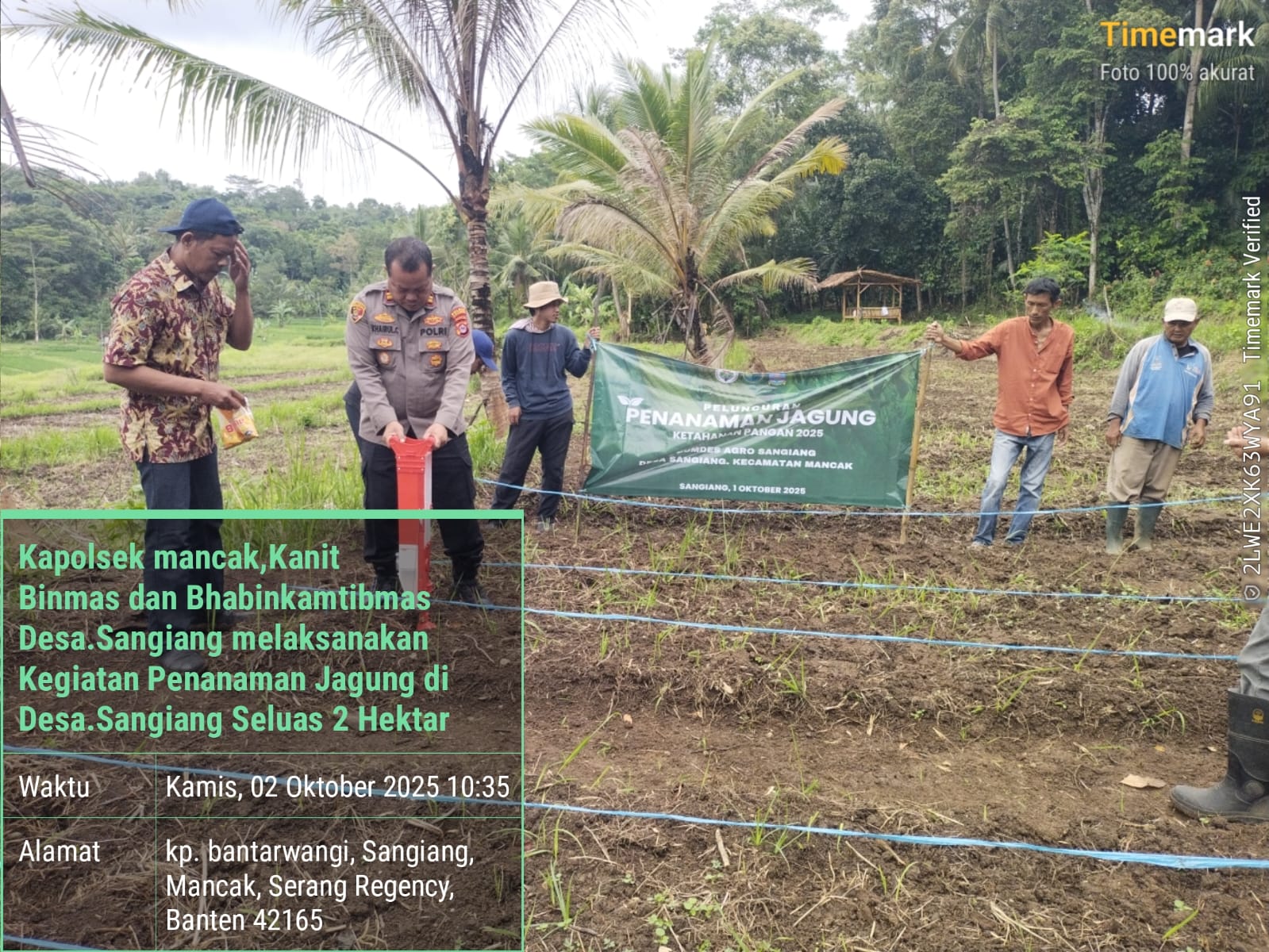 Kapolres Cilegon Polda Banten AKBP Dr. Martua Raja Taripar Laut Silitonga Kapolsek Mancak IPTU KHAERUL C Bersama AIPTU OKRIANTO, S.H Dan AIPDA AGUS YEYEN K, S.KOM. Serta Ibu, Camat Kec. Mancak dan didampingi oleh kelompok Tani Melaksanakan Kegiatan Sambang dan Monitoring penanaman Jagung .