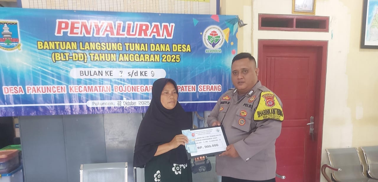 Cilegon ~ Personel Bhabinkamtibmas Polsek Bojonegara  Polres Cilegon Polda Banten, melaksanakan kegiatan pengamanan dan pengawalan penyaluran Bantuan Langsung Tunai Dana Desa (BLT-DD) di Desa Pakuncen  , sebagai upaya dalam menghadirkan rasa aman bagi warga masyarakat penerima bantuan tersebut. Jumat (03/10/2025).