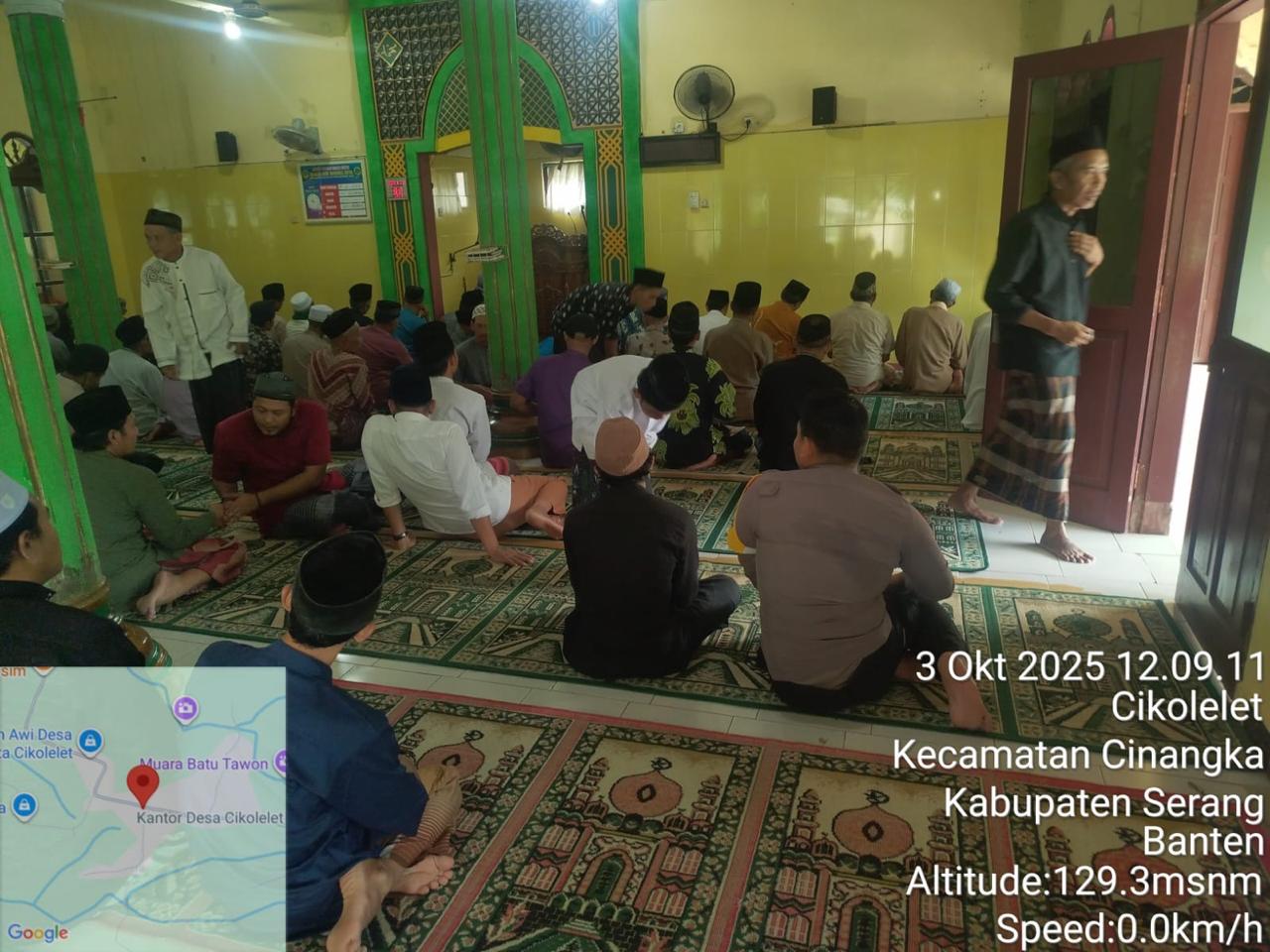 *POLRES CILEGON* - Kapolsek Cinangka Polres Cilegon Polda Banten dan Jajaran melaksanakan giat Juma't keliling dalam rangka silaturahmi menjalin kemitaraan dan menjaga Harkamtibmas di Desa Binaannya sebagai bentuk mendukung Program Quick Wins Presisi Polri, Jumat (03/10/2025).