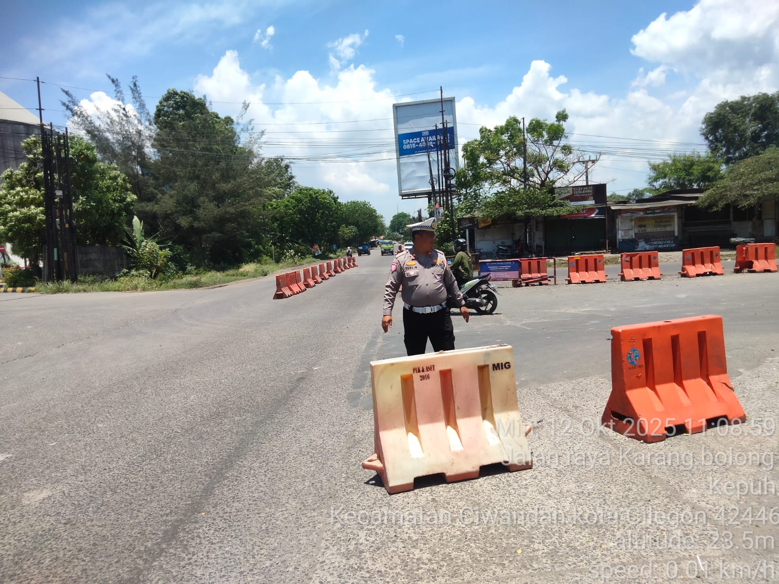 Cilegon - Personil Unit Lantas Polsek Ciwandan Polres Cilegon Polda Banten melaksanakan kegiatan monitoring jalur wisata di depan Pos Lantas JLS Ciwandan, Minggu, (12/10/2025).