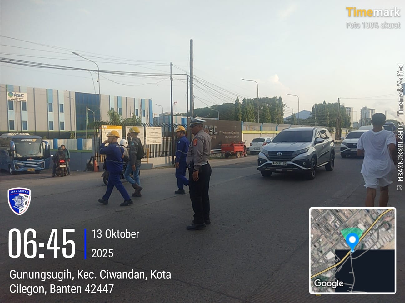 Cilegon - Personil Polsek Ciwandan Polres Cilegon Polda Banten melaksanakan giat Strong Poin Pengaturan Lalu Lintas Disimpang Brown Kelurahan Gunung Sugih guna menciptakan ketertiban, keamanan dan Kelancaran Lalu-lintas bagi masyarakat, Senin (13/10/2025).