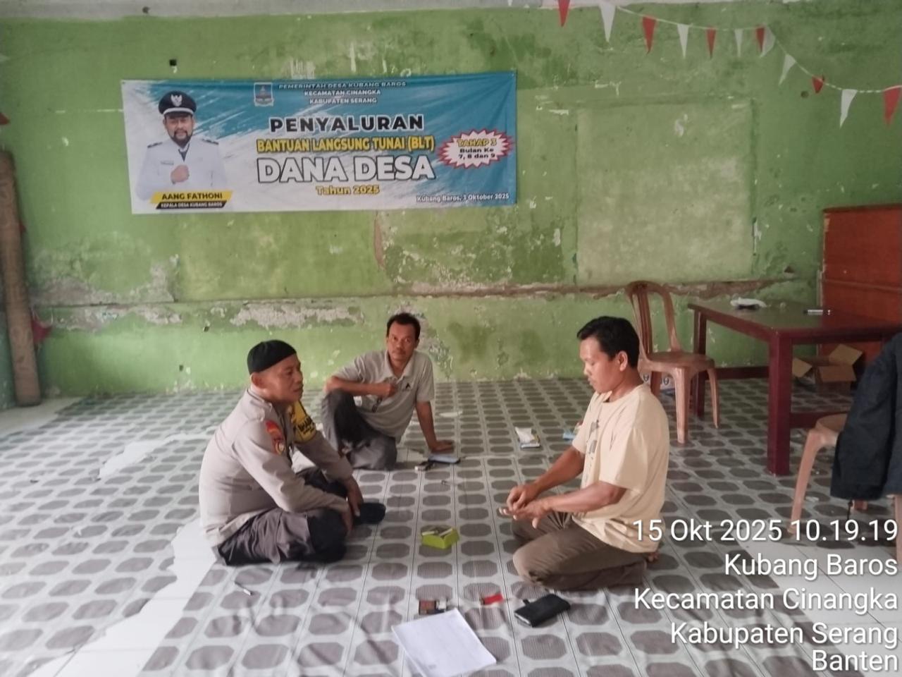 CILEGON dalam Rangka Mengantisipasi Gktm di wilayah Personil Bhabinkamtibmas Cinangka melaksanakan patroli Dialogis dengan Kepala Desa dan warga dan Menanyakan situasi Kamtibmas di wilayah dalam Rangka Menjaga Harkamtibmas di Desa Binaannya  Kecamatan Cinangka Kab. Serang. Rabu.(15/10/2025).