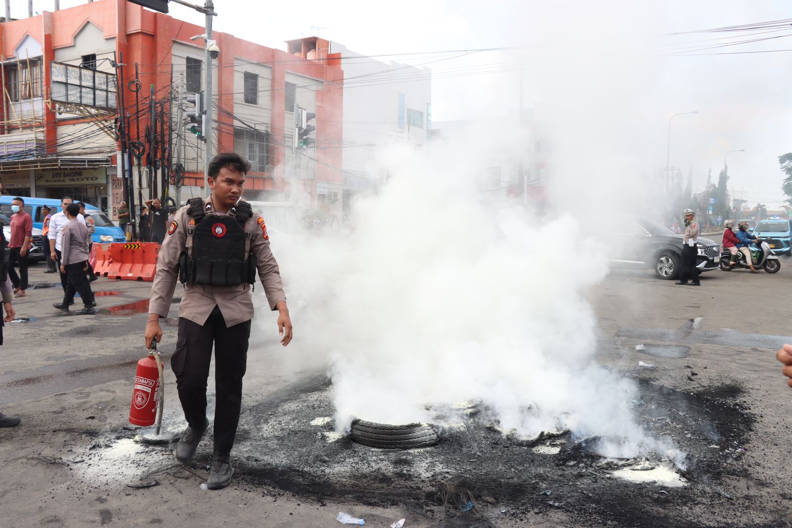 Pada pukul 14.30 WIB, massa melakukan pembakaran ban di simpang jalan sebagai bentuk ekspresi aksi. Menyikapi situasi tersebut, personel Polres Cilegon tetap mengedepankan pendekatan persuasif dan humanis agar situasi tetap terkendali.