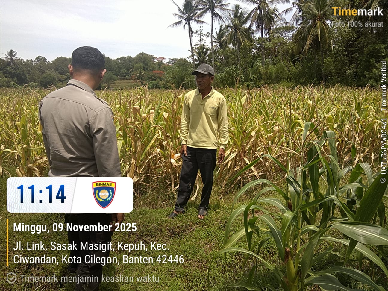 Bhabinkamtibmas Polsek Ciwandan Polres Cilegon Polda Banten, memantau Lahan Dan Tanaman jagung Kelompok Tani Lingkungan Binaan.