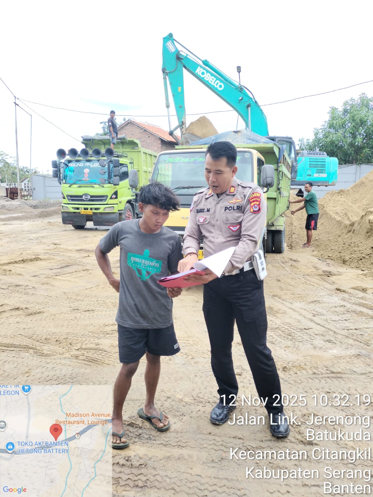 Cilegon - Kanit Lantas Polsek Ciwandan AKP Haris Munandar melaksanakan Himbauan SK Gubernur Dan monitoring stokfile pasir Didaerah hukum Polsek Ciwandan, Rabu (12/11/2025).