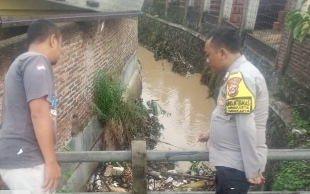 Babinkamtibmas Bripka Nugraha melakukan pemantauan kondisi sungai pasca hujan deras di lingkungan Kaligandu, Kelurahan Purwakarta, Kecamatan Kota Cilegon