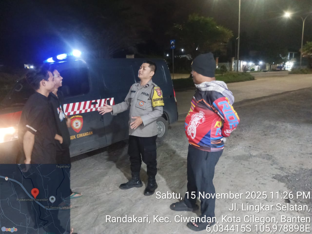 Kapolres Cilegon Polda Banten AKBP Dr. Martua Raja Taripar Laut Silitonga Melalui Kapolsek Ciwandan Polres Cilegon Polda Banten KOMPOL Andi Suherman Mengatakan bahwa setiap malam Personil Polsek Ciwandan Polres Cilegon Polda Banten menggelar patroli dengan menyasar daerah rawan dan Pada Jam Yang Dianggap Rawan, Hal tersebut dilakukan untuk mencegah terjadinya gangguan kamtibmas seperti kejahatan jalanan jambret ataupun curanmor.
