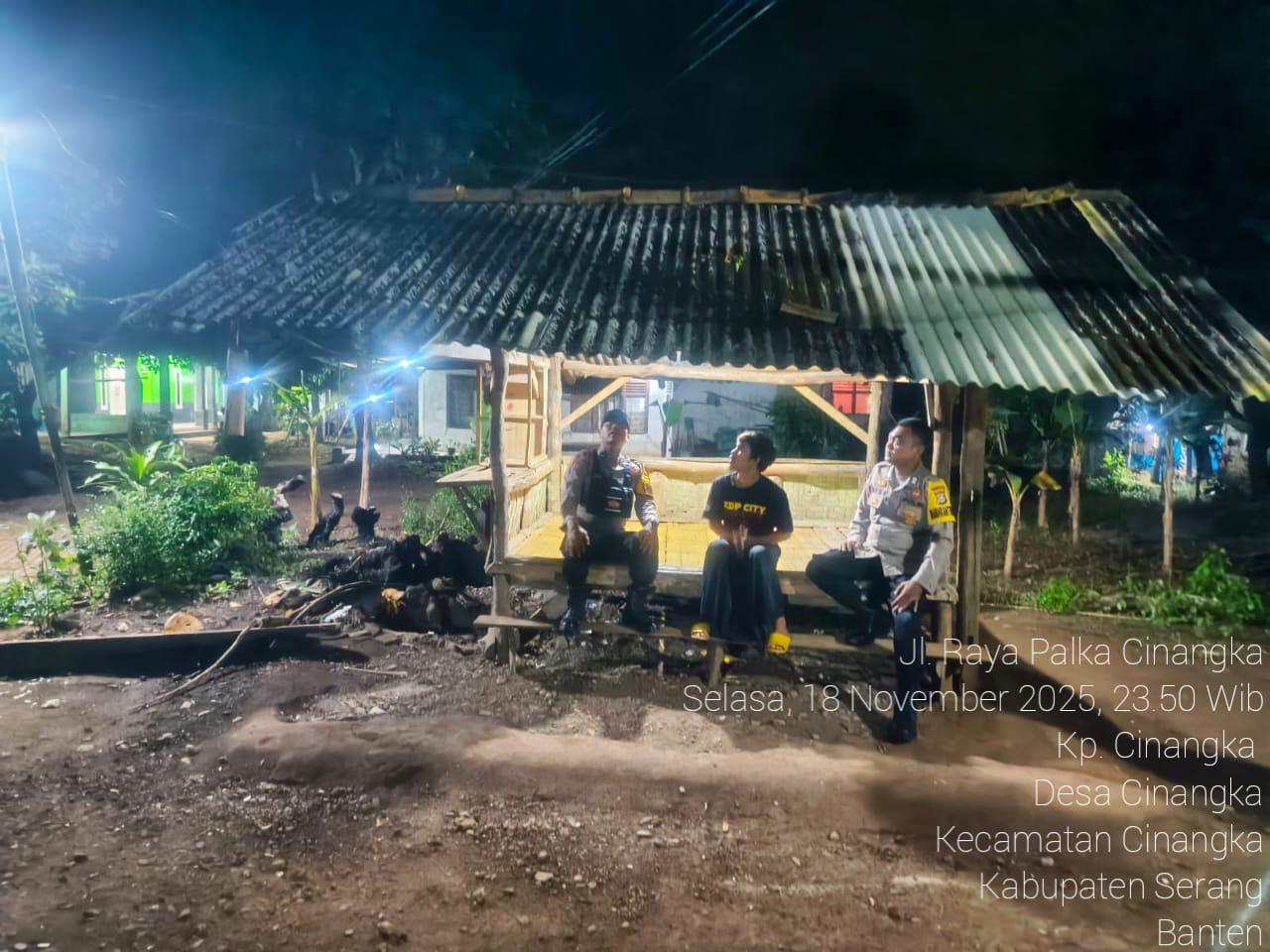 *Polres Cilegon* || Personel Bhabinkamtibmas Polsek Cinangka melaksanakan Program Komandan Wish Kapolda Banten RONDA SATKAMLING menyampaikan komunikasi dengan Petugas Siskamling agar berperan aktif dalam menciptakan Harkamtibmas yang aman dan Kondusif, Rabu (19/11/2025).