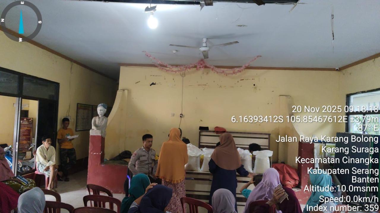 *Polres Cilegon* - Bhabinkamtibmas Desa Karagsuraga Polsek Cinangka Polres Cilegon Polda Banten Bripka Oki Berikan Pengamanan, Monitoring dan Kawal Pelaksanaan Penyaluran Bantuan Pangan Non Tunai Dari Badan Pangan Nasional Di Aula kantor Desa Karangsuraga kecamatan Cinangka Kab Serang, Kamis (20/11/2025).