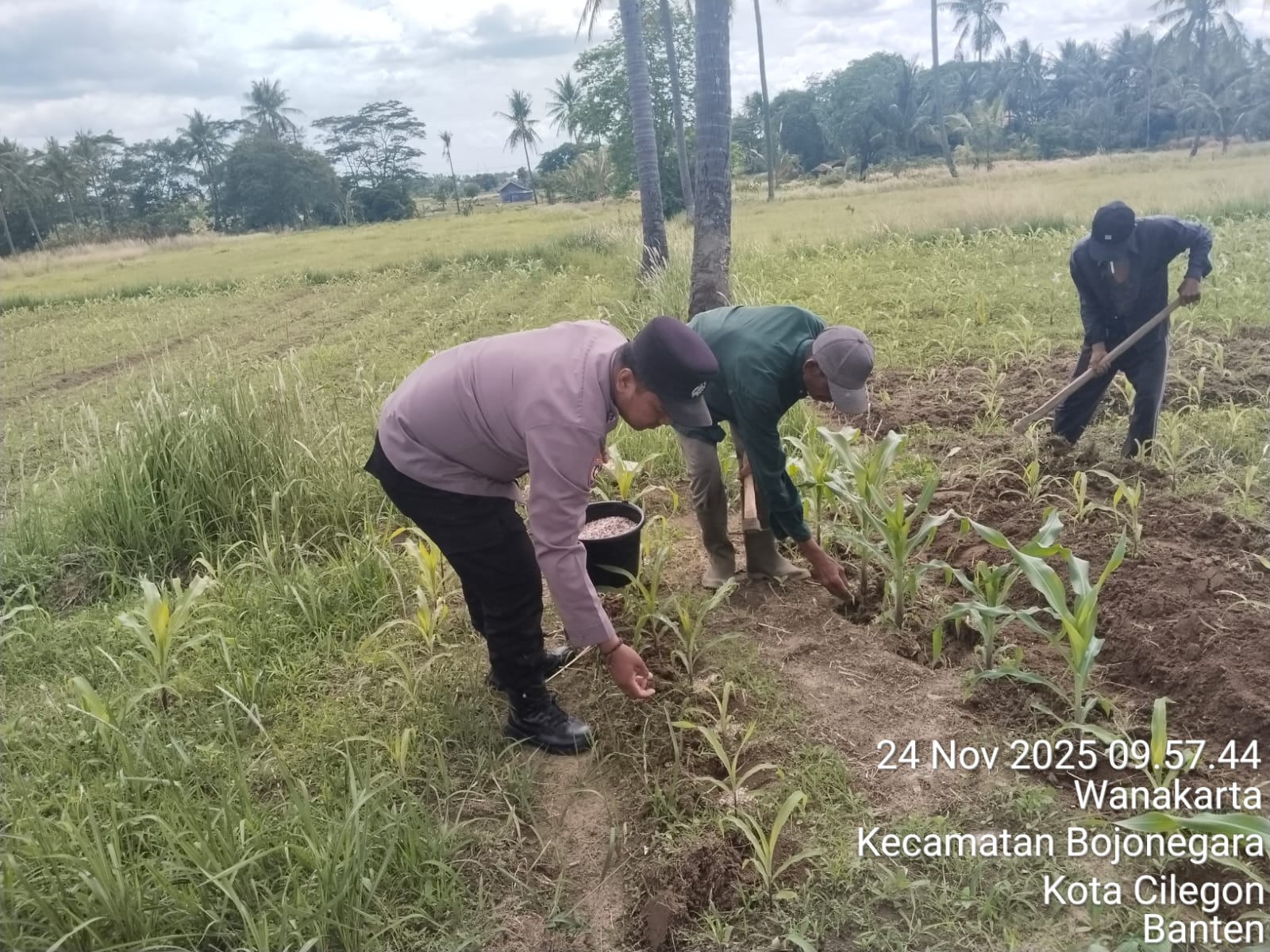 Cilegon - Melaksanakan program pemerintah, penanaman jagung dalam program ketahanan pangan, personil Polsek Kp Merak Polres Cilegon Polda Banten melaksanakan kegiatan peninjauan serta monitoring lokasi yang nantinya akan ditanami bibit jagung unggul di Desa Mangkunegara Kecamatan Bojonegara, Kabupaten Serang, Senin (24/11/2025).