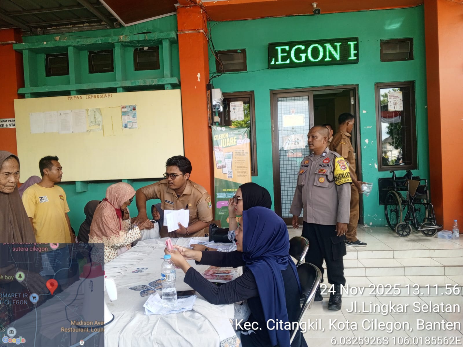 Cilegon - Bhabinkamtibmas Kelurahan Lebak Denok, AIPTU YUDI SETIAWAN, melaksanakan pengamanan dan monitoring bantuan langsung tunai dari Kementerian Sosial RI di Kantor Kelurahan Lebak Denok, Kecamatan Citangkil, Kota Cilegon, Senin (24/11/2025).