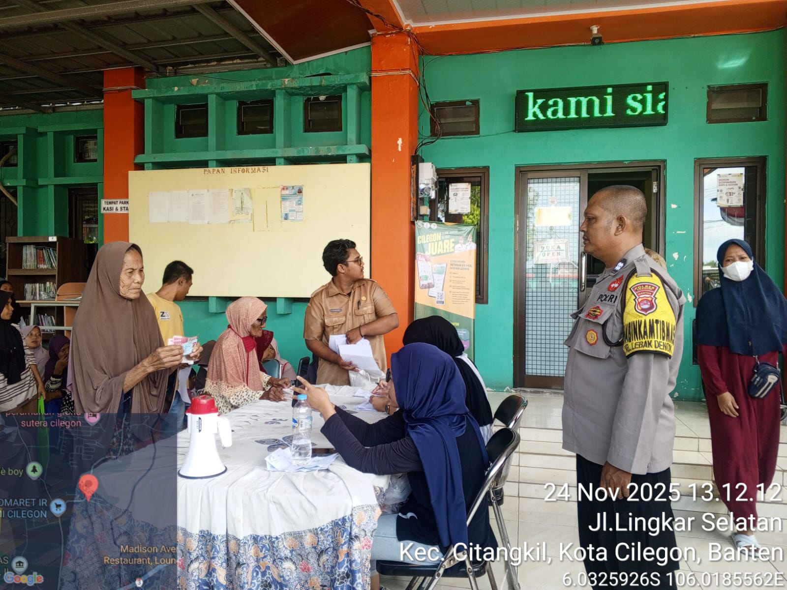 Cilegon - Bhabinkamtibmas Kelurahan Lebak Denok, AIPTU YUDI SETIAWAN, melaksanakan pengamanan dan monitoring bantuan langsung tunai dari Kementerian Sosial RI di Kantor Kelurahan Lebak Denok, Kecamatan Citangkil, Kota Cilegon, Senin (24/11/2025).