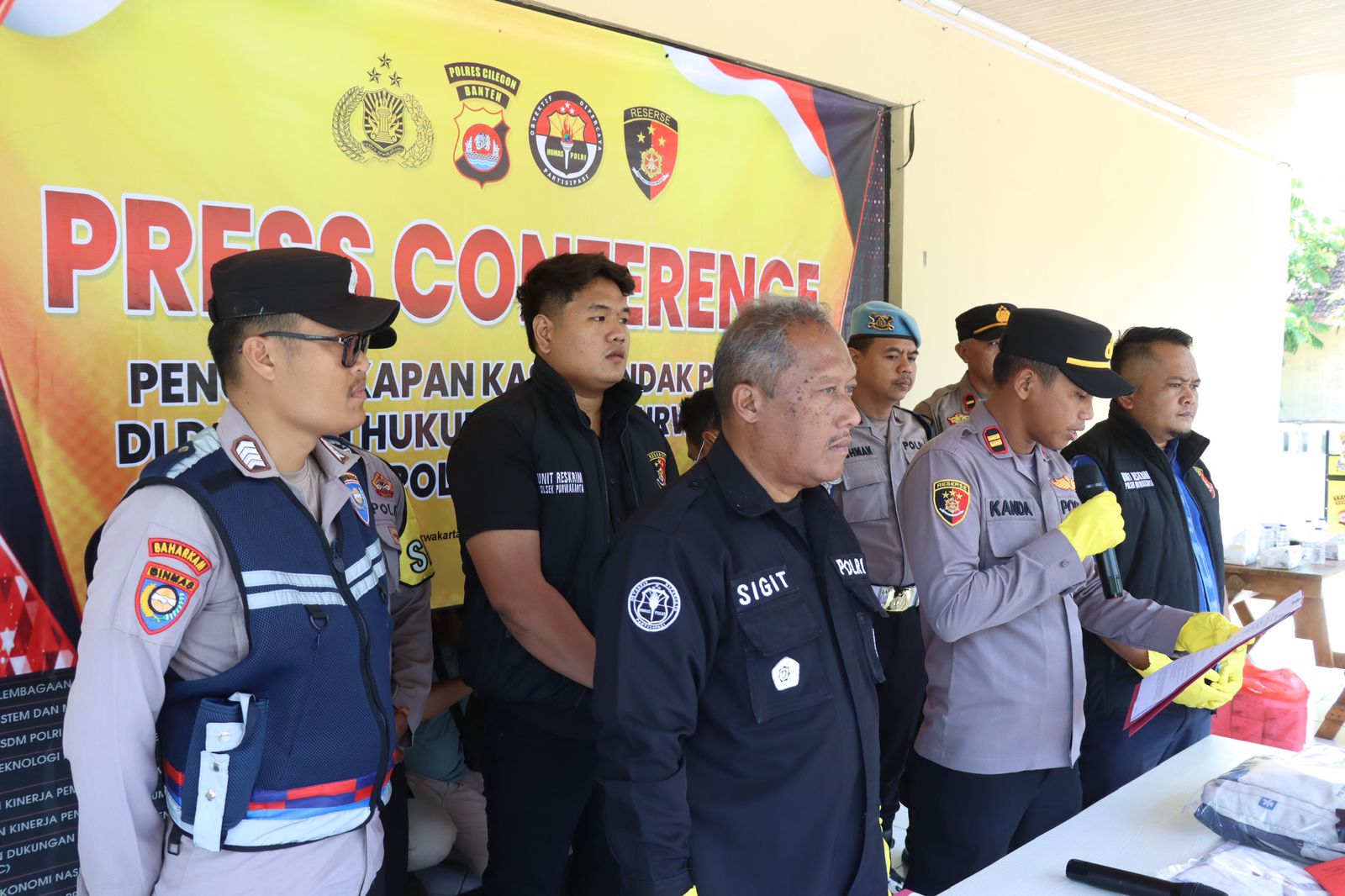 Kapolsek Purwakarta Polres Cilegon Polda Banten IPTU  Sukanda .S.M Pada saat press confrence pengungkapan kasus Pencurian HP yang terjadi di alun alun kota Cilegon dalam kegiatan senam bersama hari guru nasional pada hari Senin tanggal 24 November 2025  Pelapor sedang berada di alun-alun kota Cilegon dalam rangka mengikuti kegiatan hari guru,pada saat kegiatan senam bersama, Pelapor sedang membeli makanan di salah satu stand yang ada di lapangan alun-alun tersebut,  kemudian ada seseorang yang menyenggol tas ransel Pelapor yang sedang Pelapor pakai di bagian belakang badan Pelapor, lalu pada saat Pelapor duduk mau makan di sekitar stand tersebut, pelapor melihat tas ransel Pelapor dalam keadaan resleting terbuka. Ketika Pelapor mengecek isi dari tas ransel Pelapor, Pelapor tidak menemukan handphone yang sebelumnya Pelapor taruh di dalam tas ransel Pelapor tersebut/hilang, lalu Pelapor dan teman Pelapor Sdr Amirudin  mencari keberadaan HP Pelapor yang hilang tersebut, kemudian ada 1 (satu) orang yang Pelapor dan Sdr. Amirudin curigai karena tidak memakai kostum yang seragam dengan peserta yang lainnya, Ketika Pelapor mencurigai  1 (satu) orang tersebut, orang tersebut jalan cepat dan berlari menuju kebelakang kolam air mancur, lalu Sdr. Amirudin melaporkan kepada salah satu anggota polisi yang sedang melakukan pengamanan di sekitar alun-alun tersebut bahwa ada yang dicurigai menjadi pelaku pencurian tersebut. Kemudian ada beberapa anggota polisi yang ikut melakukan pengejaran terhadap terduga pelaku tersebut dan akhirnya terduga pelaku tersebut berhasil diamankan dan di bawa ke pos security, setelah sampai di pos security tas terduga pelaku di buka ternyata benar ada HP Pelapor yang dicuri oleh orang tersebut. Dengan kejadian tersebut pelapor mengalami kerugian sebesar RP 2.600.000 (dua juta enam ratus ribu rupian) dan selanjutnya melaporkan ke Polsek Purwakarta Polres Cilegon Polda Banten