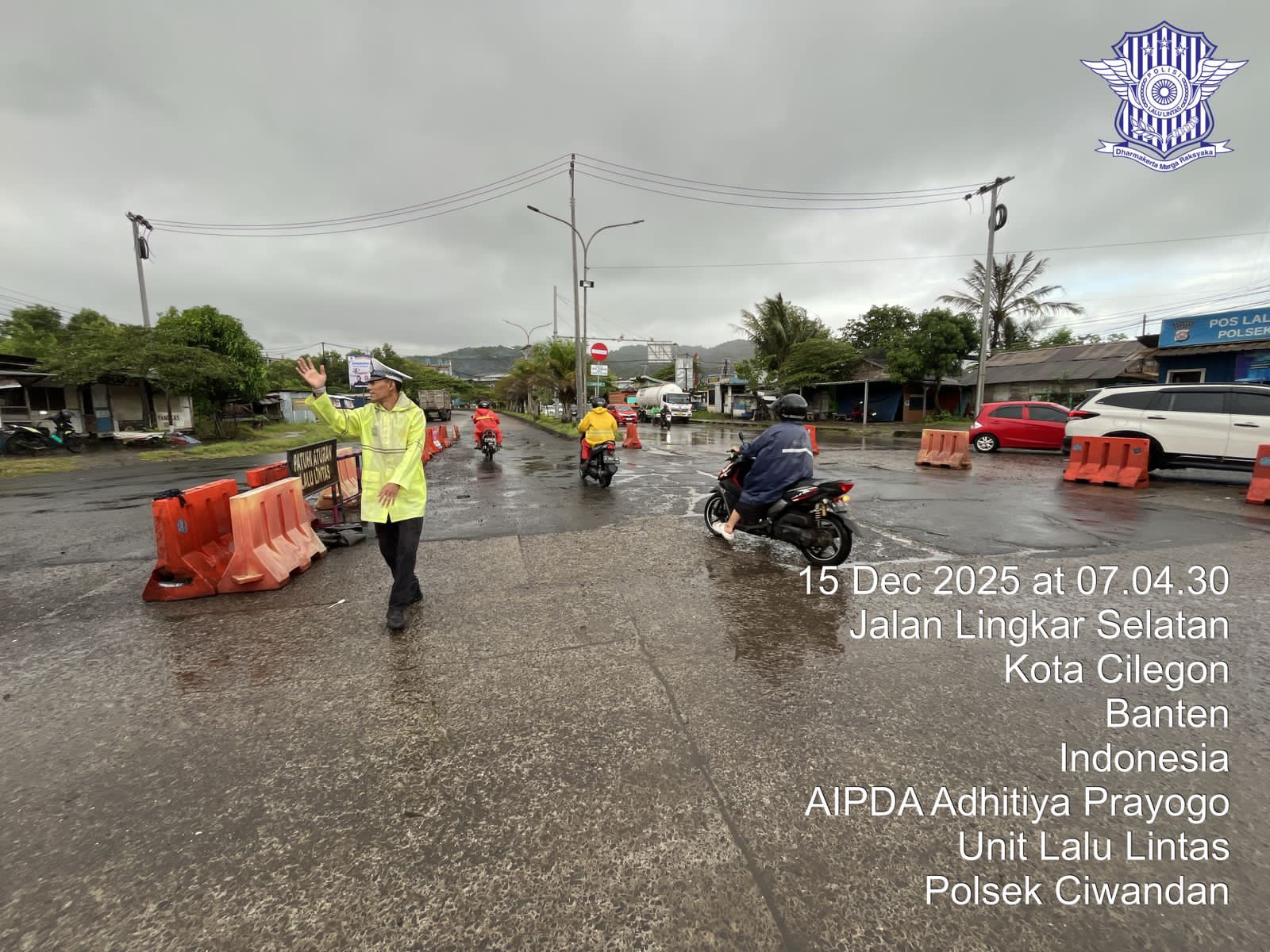 Cilegon - Unit Lalu-lintas Polsek Ciwandan Polres Cilegon Polda Banten Turunkan Personilnya melaksanakan pengaturan lalu lintas di Simpang JLS Ciwandan Pertigaan PT. Cemindo kelurahan Kepuh Kecamatan Ciwandan Kota Cilegon, Senin (15/12/2025).