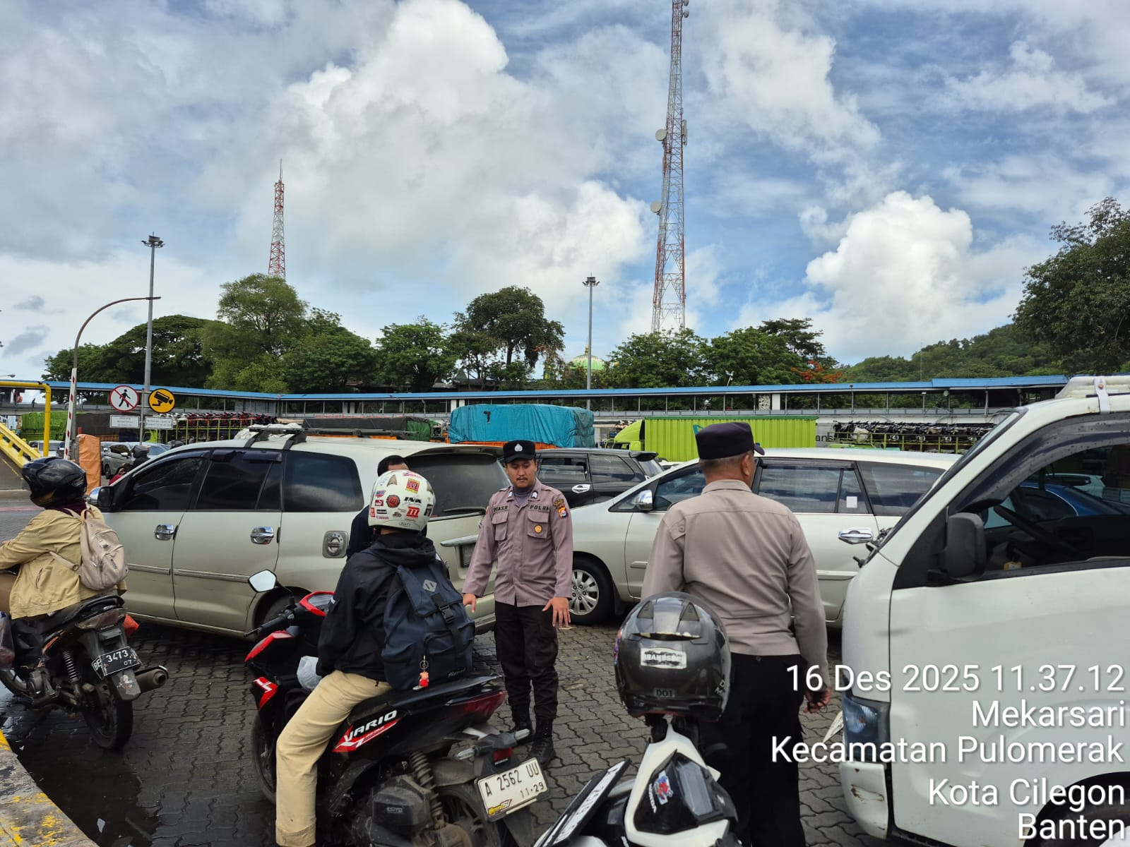 Cilegon - Personel Polsek Kskp Merak Polres Cilegon Polda Banten melaksanakan sambang dan patroli kawasan pelabuhan merak dalam rangka menjaga Harkamtibmas di Kawasan Pelabuhan Merak, Selasa (16/12/2025).