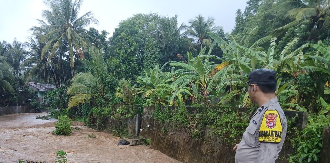 Cilegon - Personel Polsek Anyar Polres Cilegon Polda Banten melaksanakan Patroli kewilayahan mengecek debit air di Sungai pasca Hujan antisipasi banjir di wilayah Kec. Anyar,