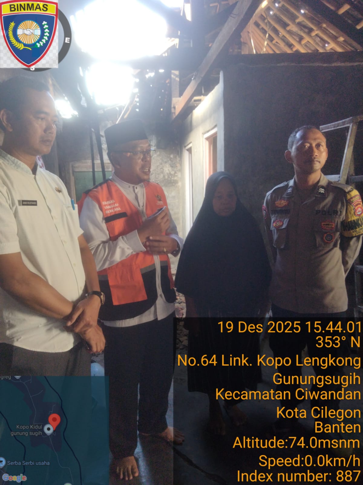 Cilegon - Bhabinkamtibmas Kelurahan Gunung Sugih AIPTU Tri Widodo, mendampingi BAZNAS Kota Cilegon memberikan bantuan kepada Ibu Junariyah, warga Link Kopo Landoh, Kel. Gunung Sugih, Ciwandan, Jum'at (19/12/2025).