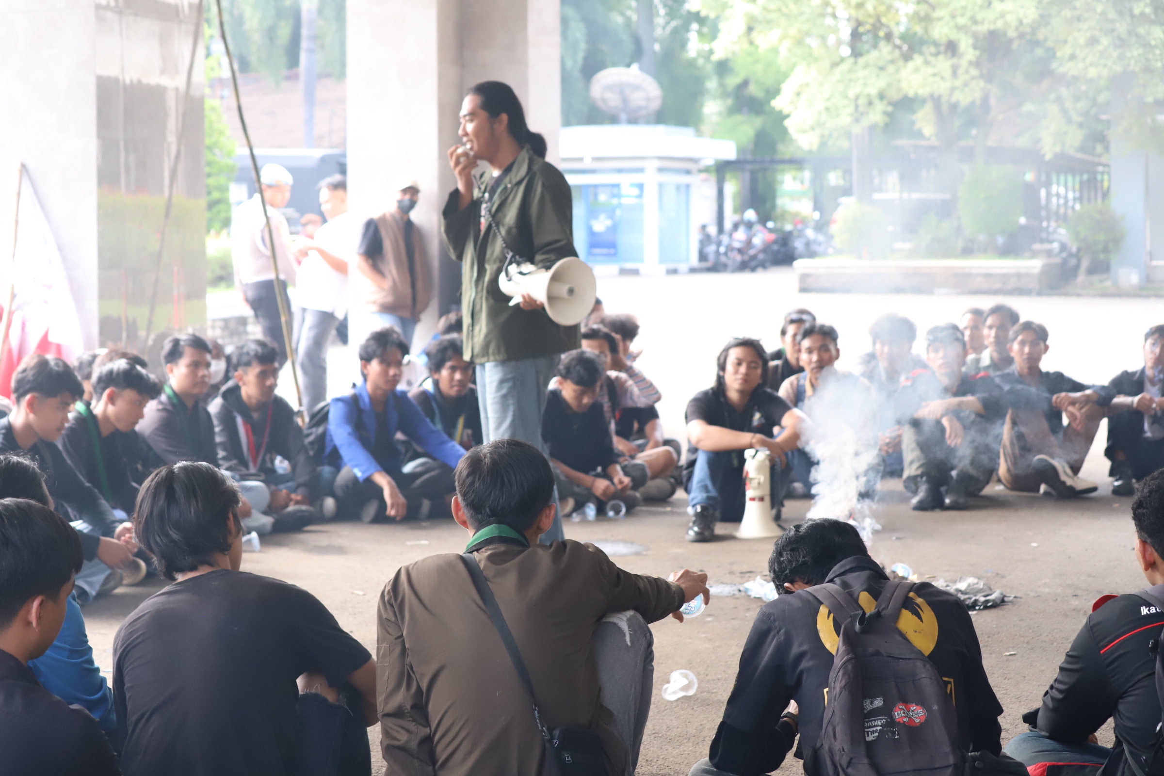 Massa aksi yang terdiri dari gabungan sejumlah organisasi mahasiswa, di antaranya Ikatan Mahasiswa Cilegon (IMC), Pergerakan Mahasiswa Islam Indonesia (PMII), Himpunan Mahasiswa Islam (HMI), serta Gerakan Mahasiswa Nasional Indonesia (GMNI), mulai berkumpul di Masjid Al-Hadid, Kelurahan Ramanuju, Kecamatan Purwakarta, sekitar pukul 13.50 WIB.