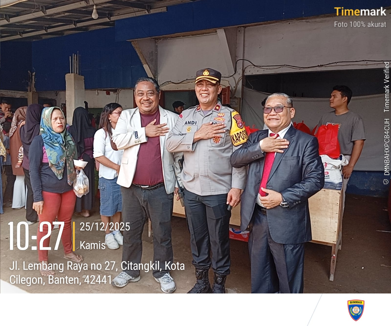 Kapolres Cilegon Polda Banten AKBP Dr. Martua Raja Taripar Laut Silitonga Melalui Kapolsek Ciwandan KOMPOL Andi Suherman Mengatakan Dalam rangka kegiatan ibadah Pera Natal Tahun 2025 yang dilaksanakan oleh jemaat rumah Doa GBI, Personil Polsek Ciwandan memberikan pelayanan pengamanan yang dimulai dengan melaksanakan sterilisasi manual dan dilanjutkan pengamanan kegiatan ibadah sampai rangkaian pelaksanaan ibadah selesai dilaksanakan.