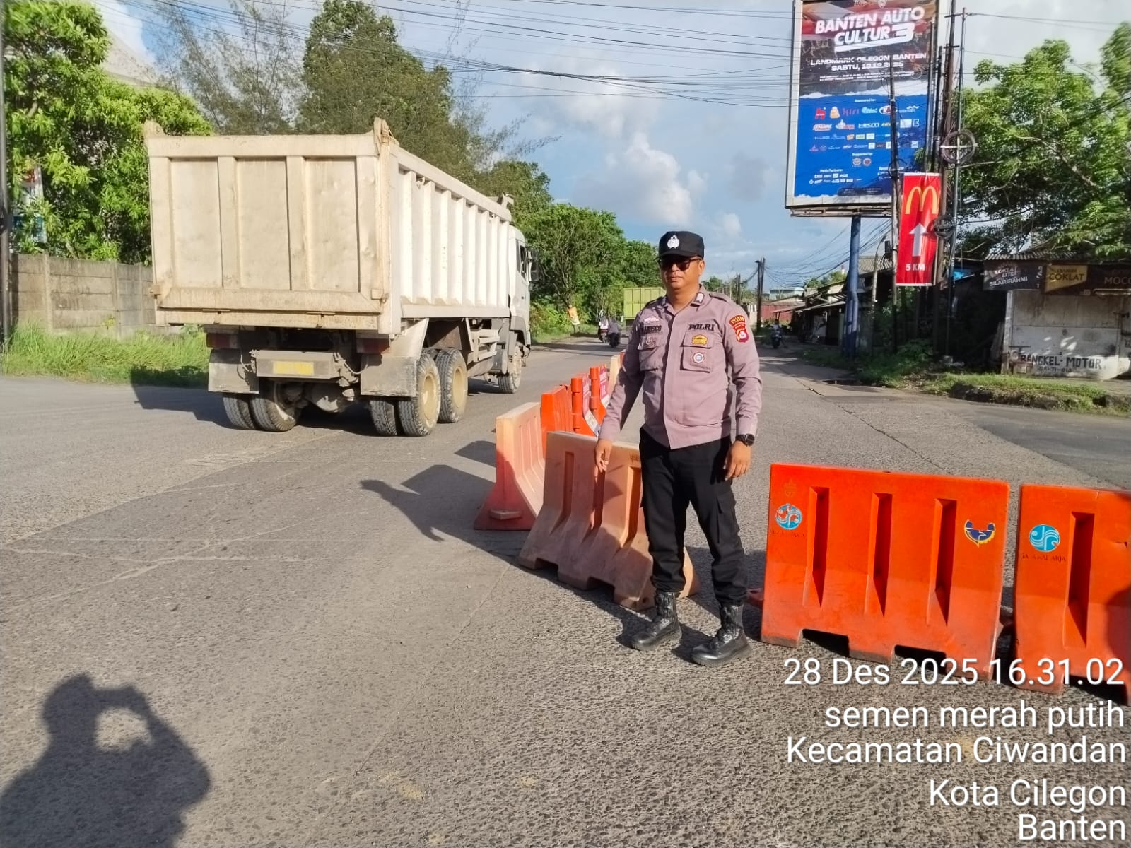 Cilegon - Guna Menciptakan kelancaran arus Lalu-Lintas Perayaan Natal Dan Tahun Baru menuju jalur wisata Anyer-Cinagka yang ada di daerah hukum Polsek Ciwandan Polres Cilegon Polda Banten,Pospam 5 Ciwandan berlakukan rekayasa Lalu lintas, Minggu (28/12/2025).