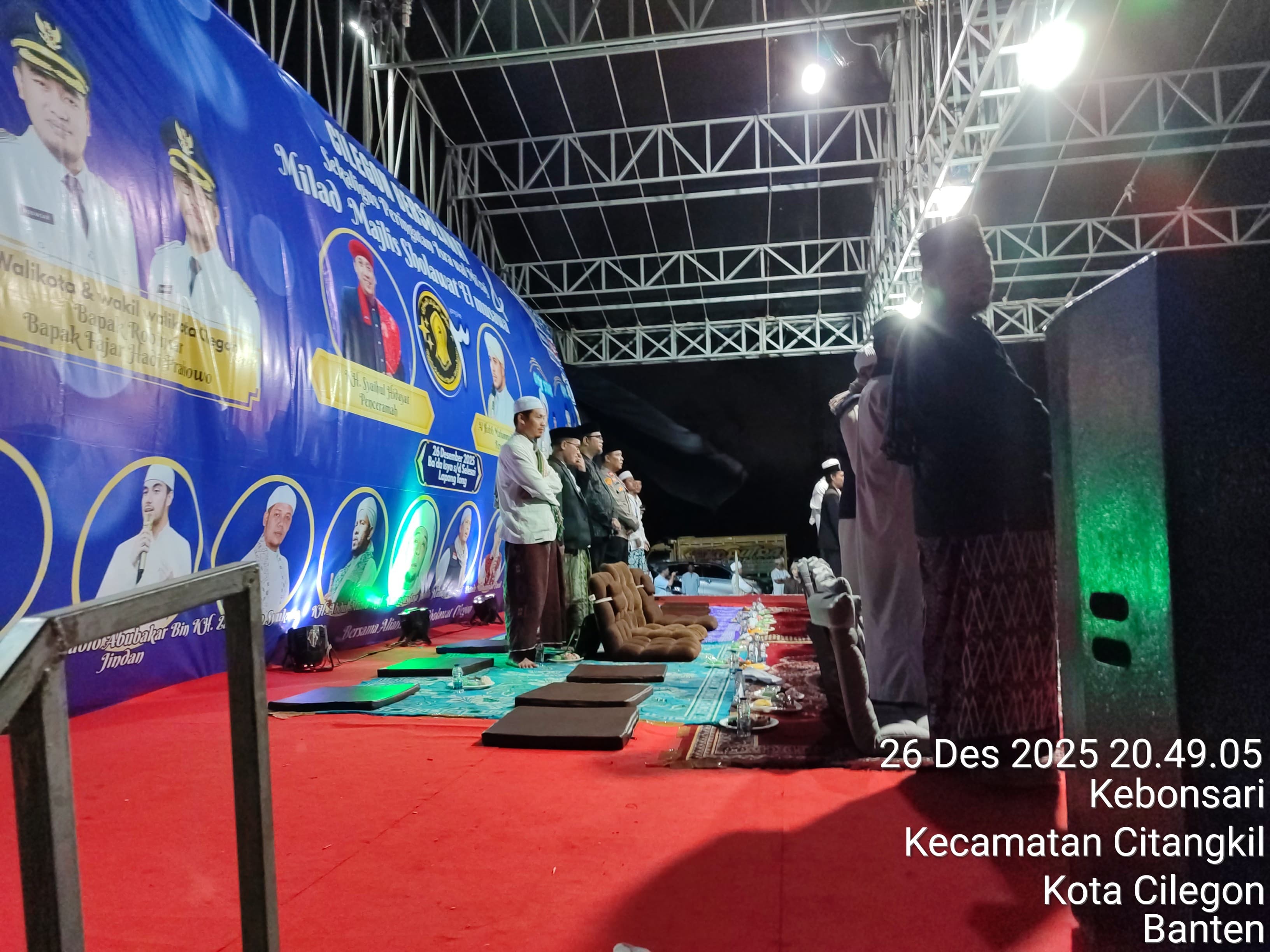 Cilegon - Polres Cilegon melalui Polsek Ciwandan melaksanakan monitoring kegiatan Gema Cilegon Bersholawat dalam rangka Majlis Sholawat El-Musawa ke-3 dan peringatan Isro Mi'raj Nabi Muhammad SAW di Lapangan Tong Alamat, Kebon Sari, Citangkil, Minggu (28/12/2025).