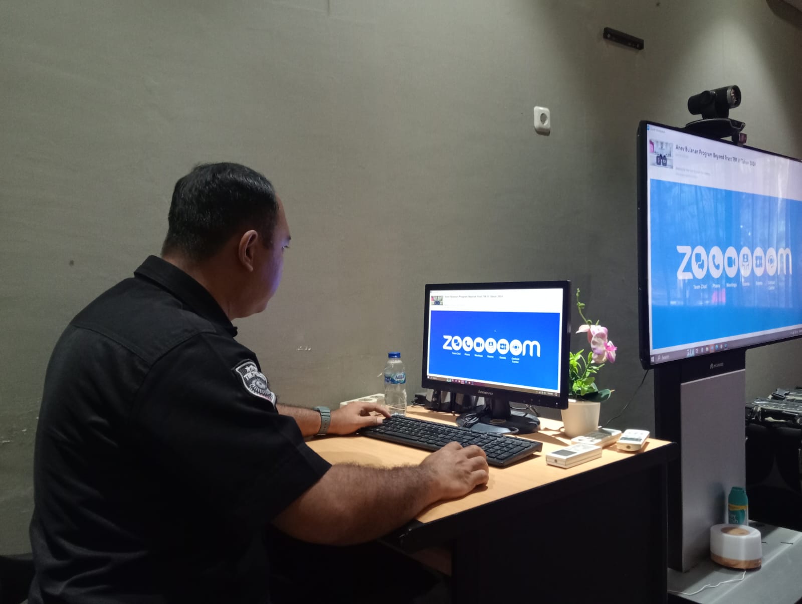 Anggota Tik Polres Cilegon Menyiapkan Sarana dan Prasarana Untuk Kegiatan Zoom meeting Dalam pelaksanaan kegiatan zoom meeting tersebut anggota TIK Polres Cilegon yang bertanggung jawab untuk menyiapkan peralatan zoom. Selain itu agar di tidak ada gangguan jaringan sebelum pelaksanaan anggota TIK melakukan pemeriksaan terhadap sarana dan prasarana tersebut . Satu jam sebelum kegiatan zoom meeting itu dimulai. Kapolres Cilegon AKBP. DR. MARTUA RAJA TARIPAR LAUT SILITONGA. melalui Kasi TIK AIPTU Suwanto, S.H. menyampaikan bahwa “untuk menunjang kelancaran penyampaian informasi anggota TIk Polres Cilegon selalu memeriksa sarana dan prasarana tersebut, sebelum maupun pada saat pelaksanaan akan selalu di monitor”