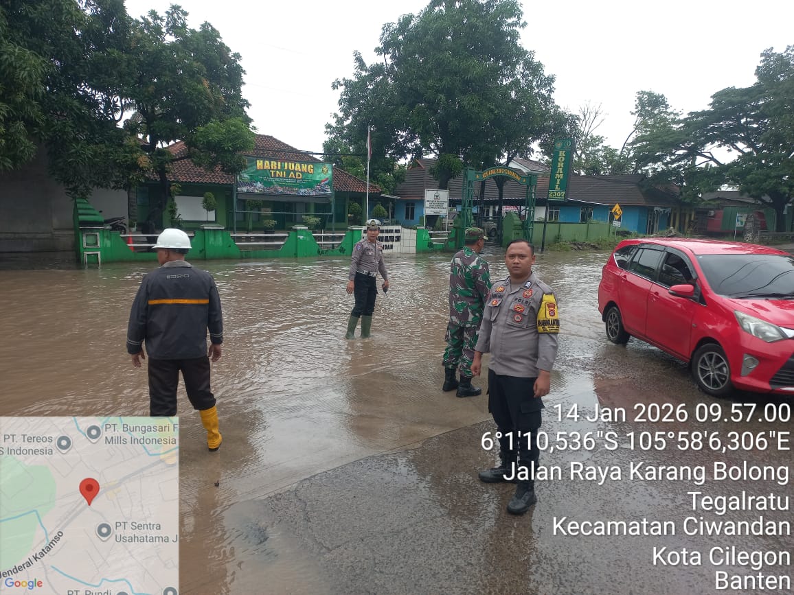 Cilegon - Personil Polsek Ciwandan melaksanakan monitoring genangan air dampak cuaca hujan lebat di wilayah hukum Polsek Ciwandan, Rabu (14/01/2026).