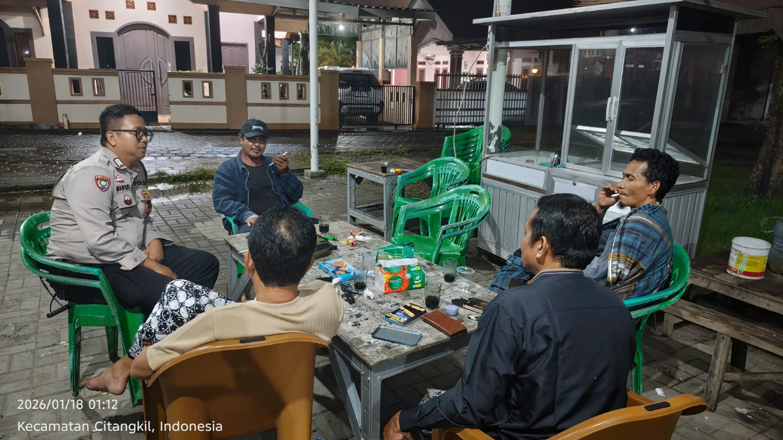 Cilegon - Bhabinkamtibmas Polsek Ciwandan Polres Cilegon Polda Banten Melaksanakan Patroli Kunjungan Malam dan terus memberikan pembinaan dan penyuluhan tentang pentingnya menjaga kamtibmas di daerah hukum Polsek Ciwandan Polres Cilegon Polda Banten, Minggu (18/01/2026).