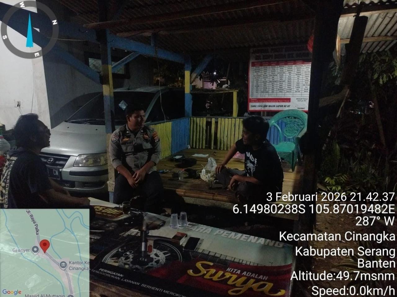 *Polres Cilegon* || Personil Bhabinkamtibmas Polsek Cinangka melaksanakan Program Komandan Wish Kapolda Banten RONDA SATKAMLING menyampaikan komunikasi dengan Petugas Siskamling agar berperan aktif dalam menciptakan Harkamtibmas yang aman dan Kondusif, Rabu (04/02/2026).